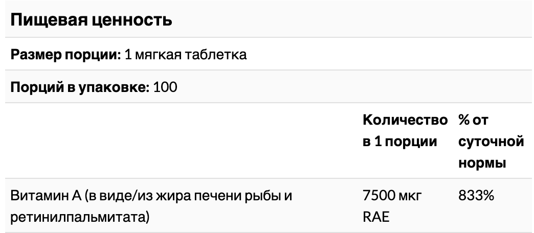 Предупреждения Не следует принимать при планировании беременности и в период беременности. В мягких гелях может происходить разделение ингредиентов. Рекомендуемая дневная порция этого продукта содержит более 10 000 МЕ витамина А из ретинола. Прием витамина A из ретинола в количестве 10 000 МЕ или больше, как известно, вызывает врожденные дефекты и наносит вред репродуктивной системе.