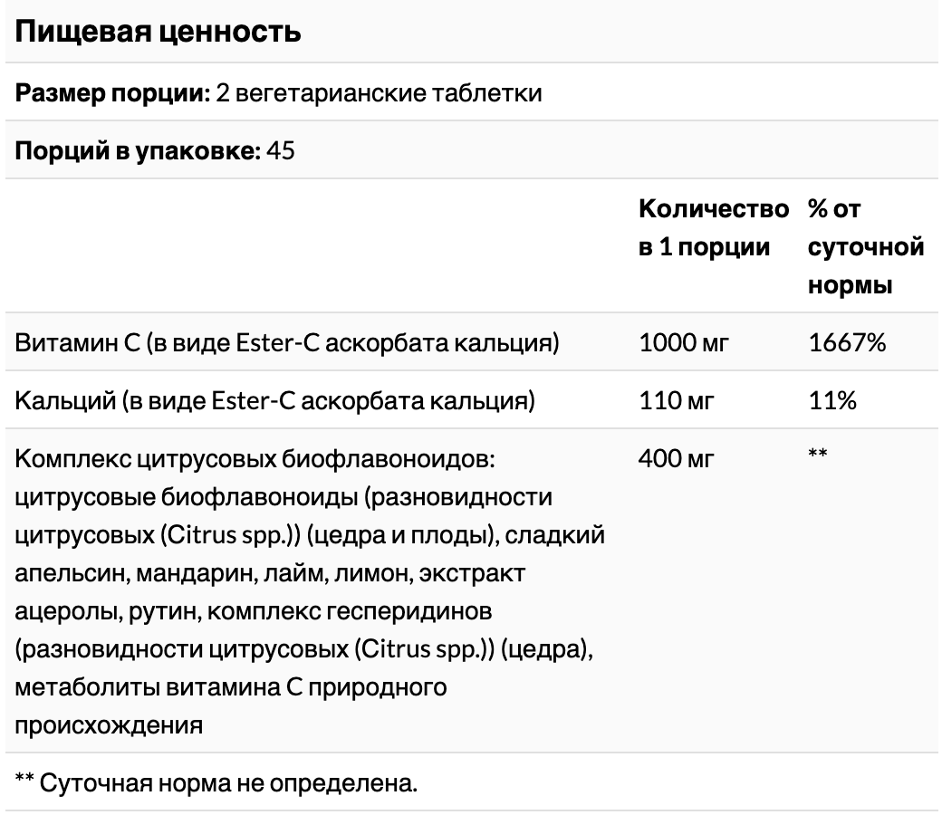 Ester-C — это революционная рецептура витамина С, содержащая метаболиты природного происхождения. Метаболиты способствуют усвоению витамина С лейкоцитами, которые являются важной составляющей иммунной системы организма. Ester-C® имеет нейтральный pH, что делает его некислым и мягким для желудка. В суточной дозе 1000 мг Ester-C® обеспечивает круглосуточную поддержку иммунитета ... так что один раз в день - все, что вам нужно. Цитрусовые биофлавоноиды, добавленные в препарат, помогут организму лучше усваивать и использовать витамин С.